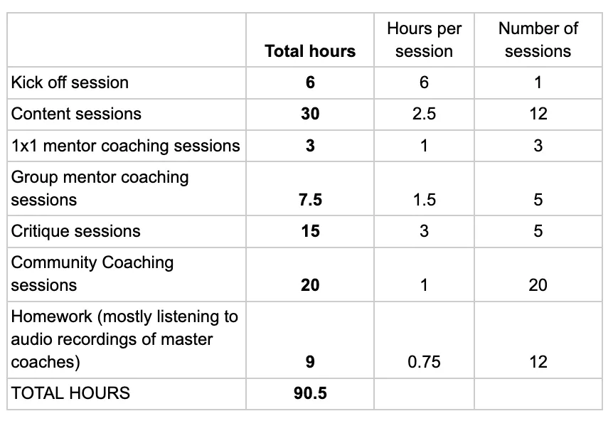 The program runs for about 3.5 months and requires–on average–seven hours per week of your time. We give you this level of detail because scheduling is a key element of what makes a coaching program right for most adults. The time is used as follows.